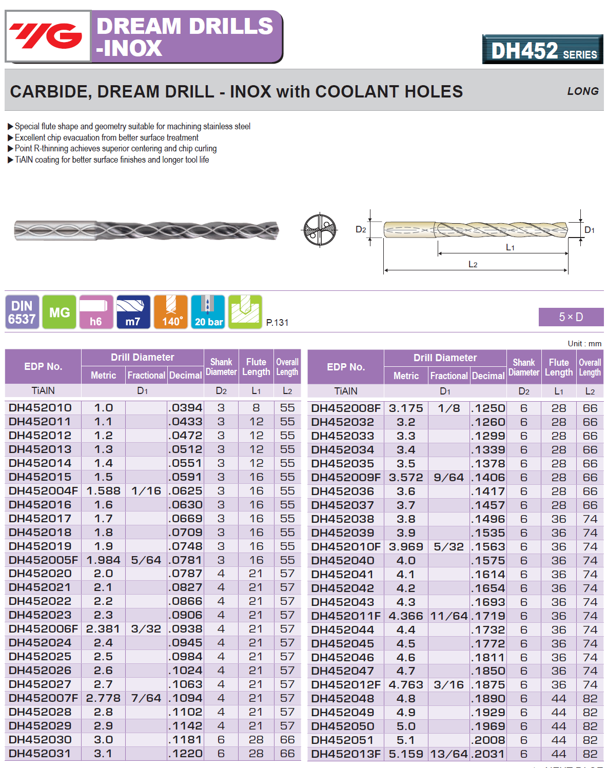 Click the button below to add the 0.0748 - YG DH452019 - 1.9mm x 3 x 16 x 55 Carbide Dream Drill for Stainless w Coolant Holes, TiAIN Coated, Long (5XD) to your wish list.