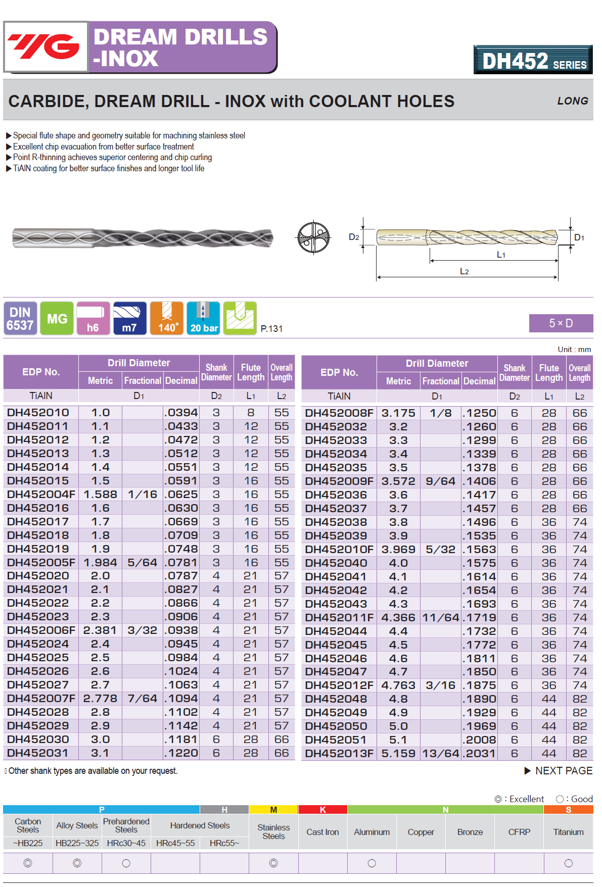 Click the button below to add the 0.1496 - YG DH452038 - 3.8mm x 6 x 36 x 74 Carbide Dream Drill for Stainless w Coolant Holes, TiAIN Coated, Long (5XD) to your wish list.
