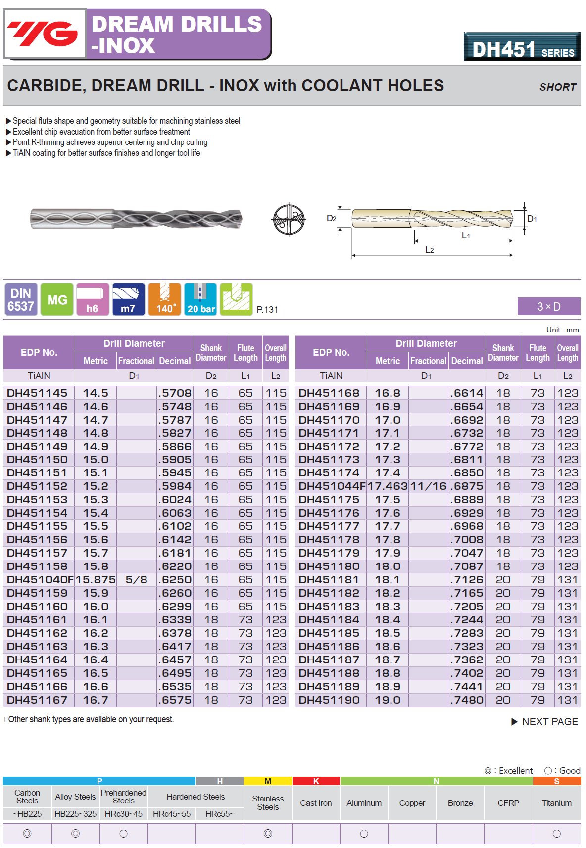 Click the button below to add the 0.6875 - YG DH451044F - 17.463(11/16) x 18 x 73 x 123 Carbide Dream Drill for Stainless w Coolant Holes, TiAIN Coated, Short (3XD) to your wish list.