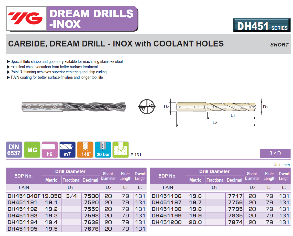 Click the button below to add the 0.7756 - YG DH451197 - 19.7mm x 20 x 79 x 131 Carbide Dream Drill for Stainless w Coolant Holes, TiAIN Coated, Short (3XD) to your wish list.