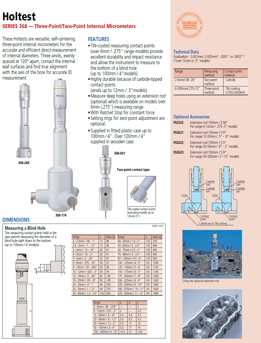 Mitutoyo 368-164 - 12-16 mm Holtest Internal Micrometer with Tin coated Cont. Pts.