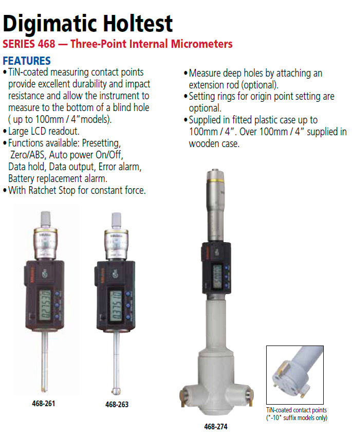 Mitutoyo 468-974 - Digimatic Holtests Three-Point Internal Micrometers 50-100 mm SPC