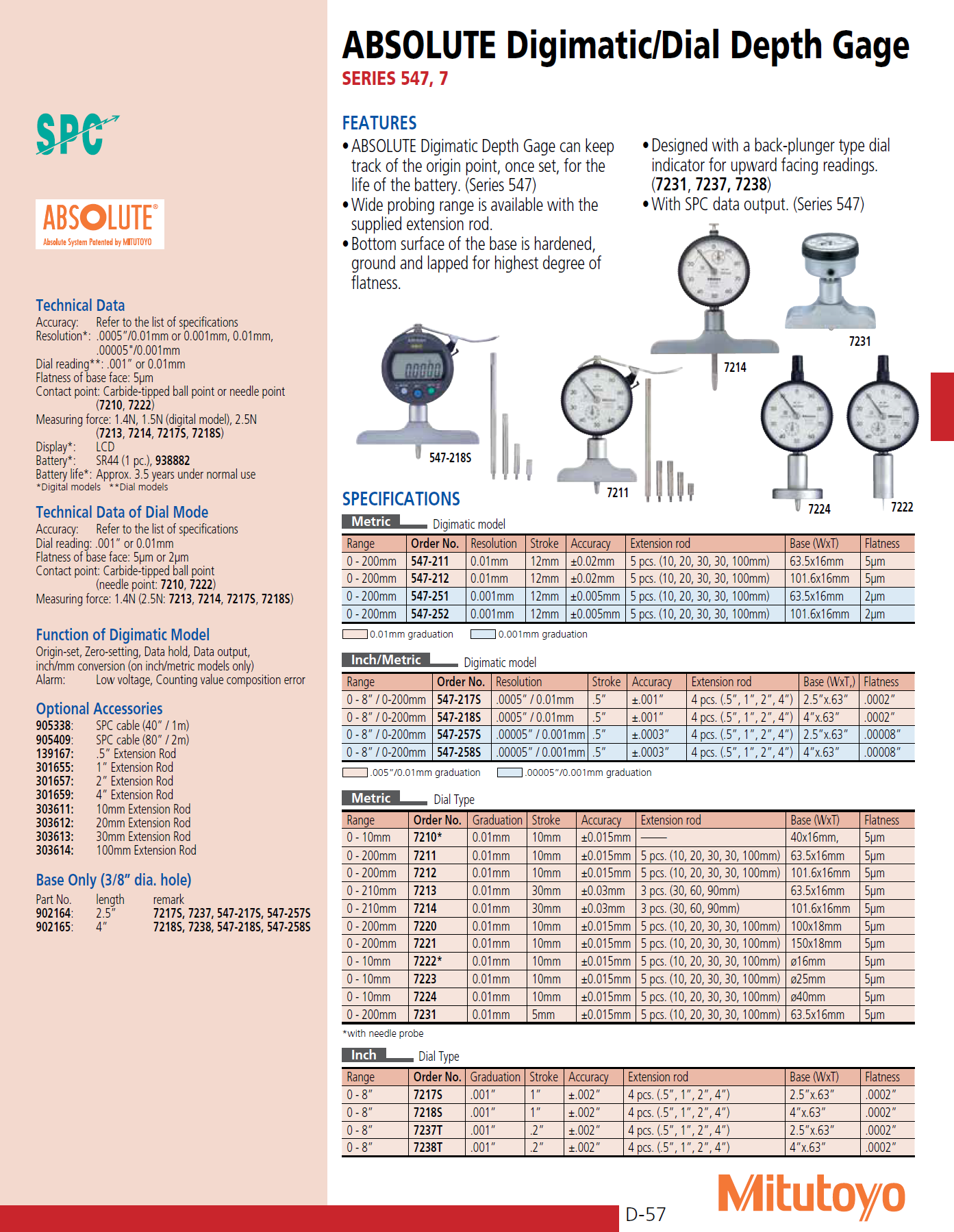 Click the button below to add the Mitutoyo 547-257A - 8" ABSOLUTE Digimatic Depth Gage 2.5" Base SPC to your wish list.