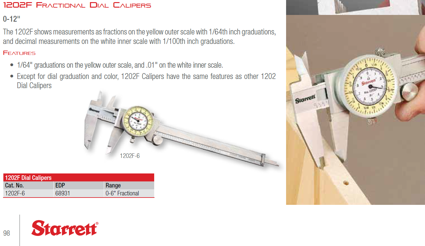 Starrett 1202F-6 - Fractional Dial Calipers for Accurate Measurement with Fitted Plastic Case - White Face, 0-6" Range, -0.002" Accuracy, 0.010" Graduations (Wood Working Applications)
