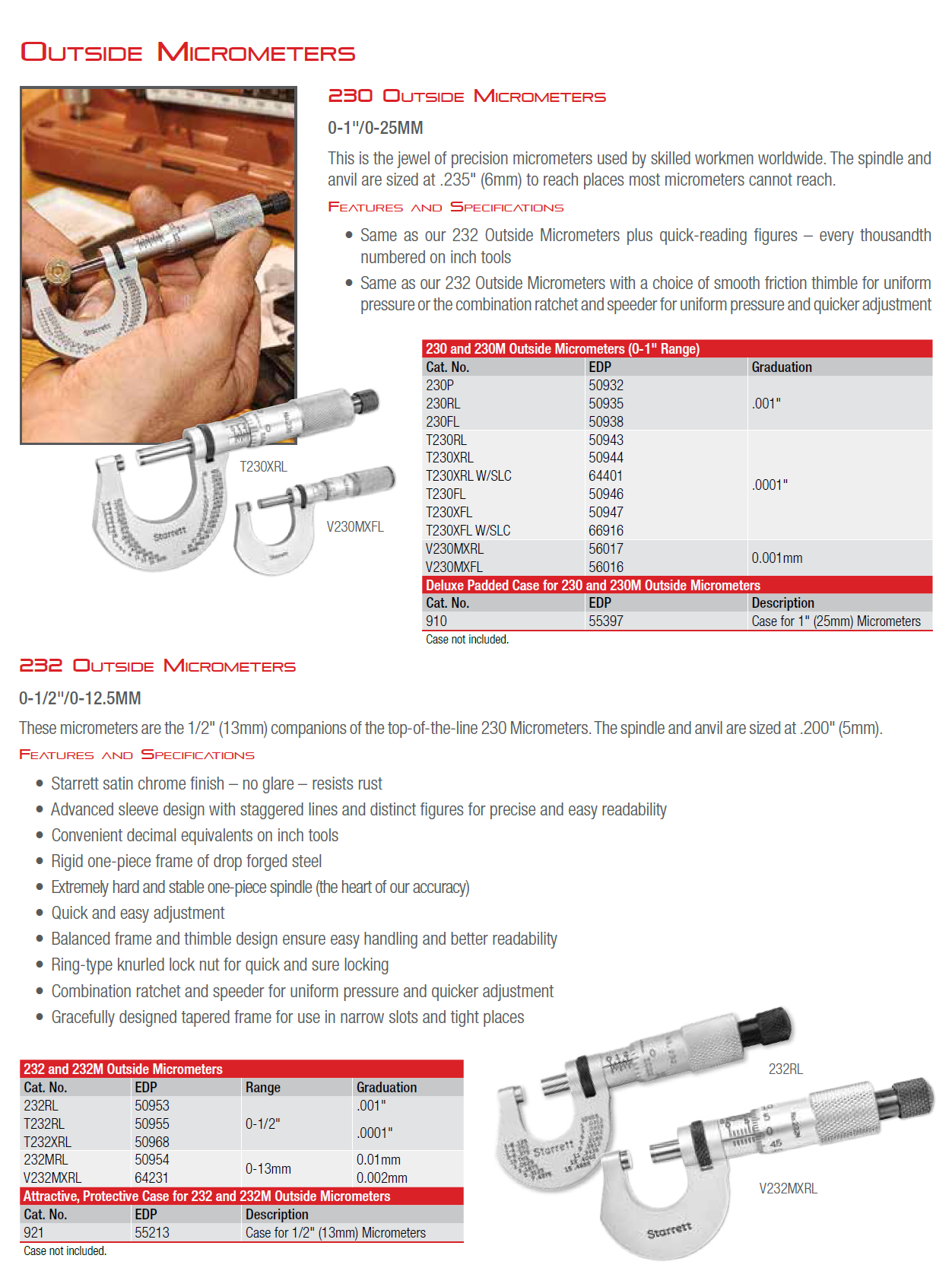 Click the button below to add the Starrett T230XFL - 1" Outside Micrometer Rachet Thimble & Carbide Anvil-Spindle 50947 USA to your wish list.