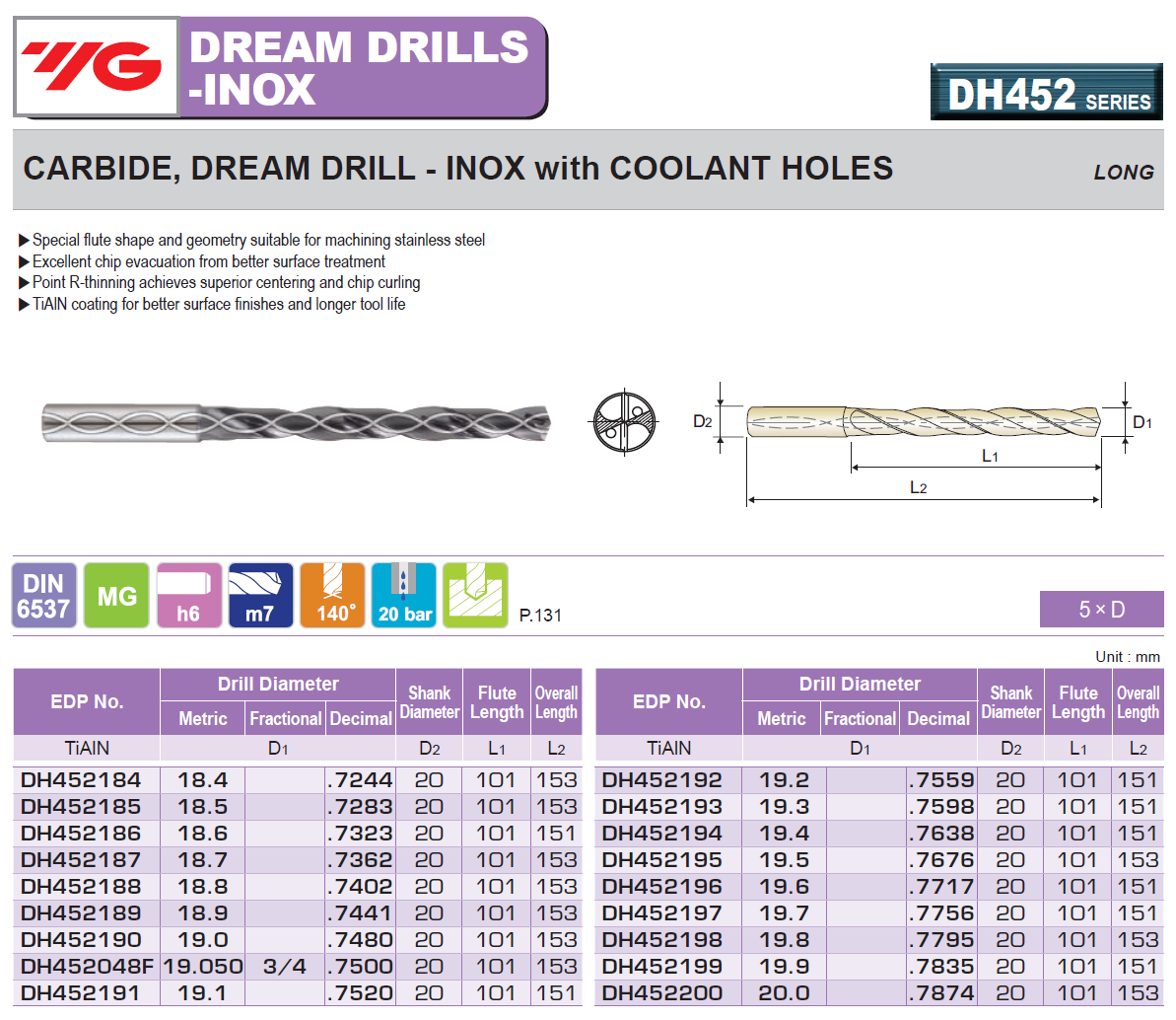Click the button below to add the 0.7402 - YG DH452188 - 18.8mm x 20 x 101 x 153 Carbide Dream Drill for Stainless w Coolant Holes, TiAIN Coated, Long (5XD) to your wish list.