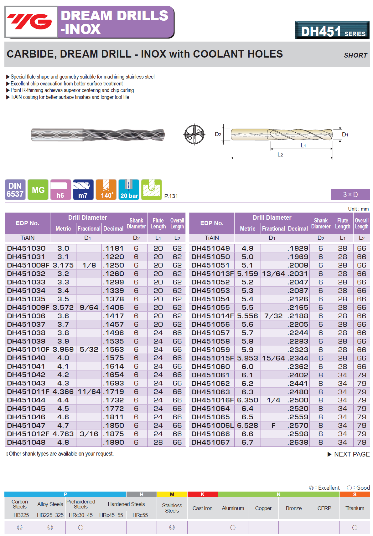 Click the button below to add the 0.1417 - YG DH451036 - 3.6mm x 6 x 20 x 62 Carbide Dream Drill for Stainless w Coolant Holes, TiAIN Coated, Short (3XD) to your wish list.