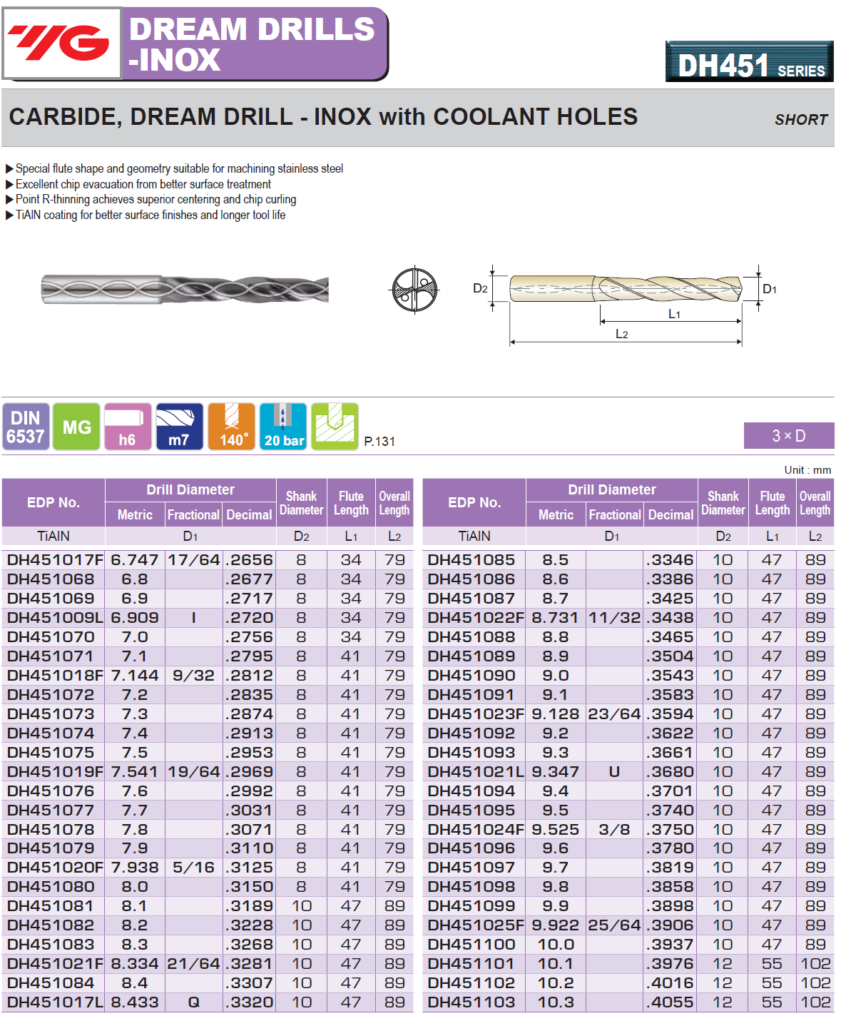 Click the button below to add the 0.3504 - YG DH451089 - 8.9mm x 10 x 47 x 89 Carbide Dream Drill for Stainless w Coolant Holes, TiAIN Coated, Short (3XD) to your wish list.