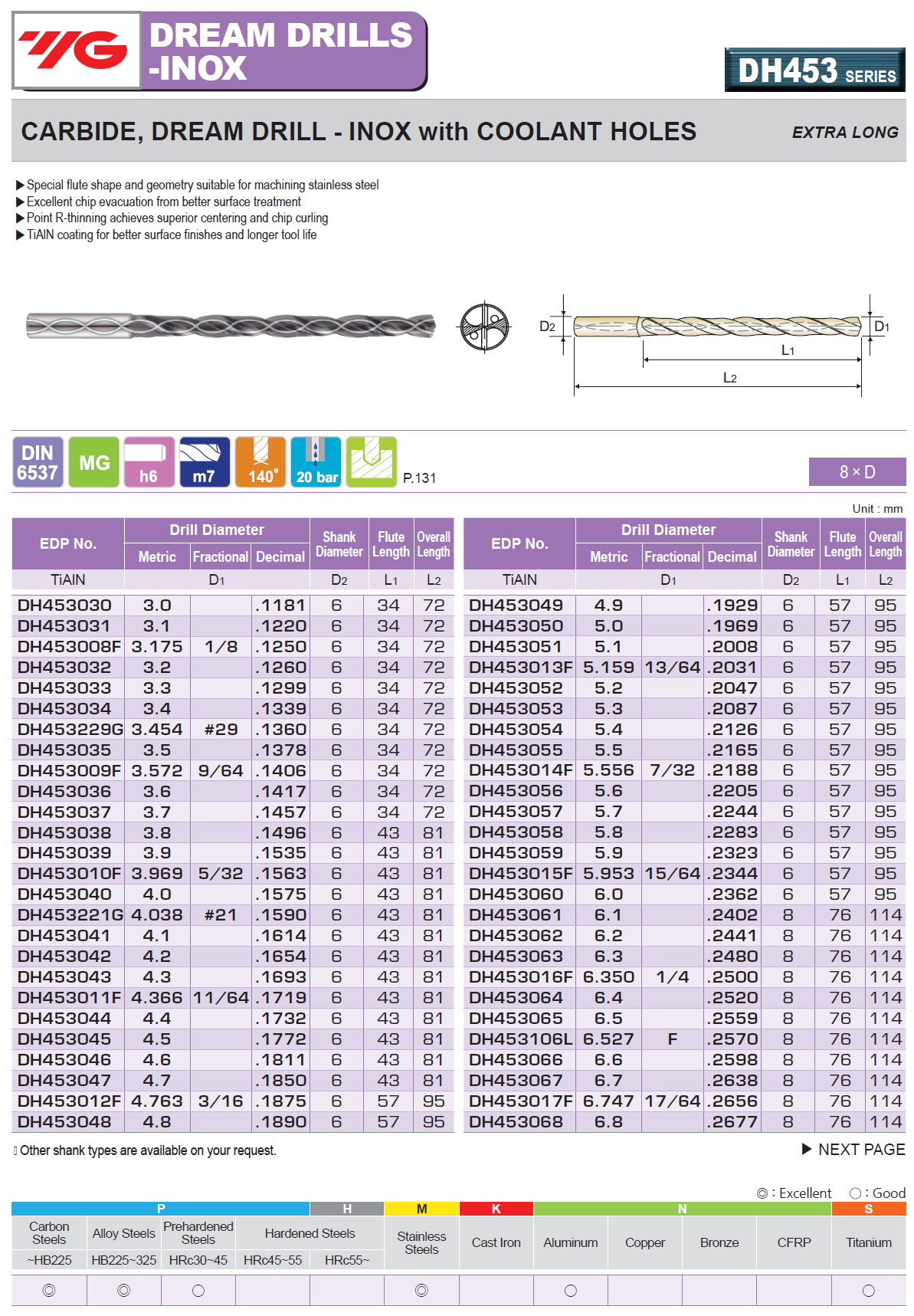Click the button below to add the YG1 DH453050 - 5.0mm x 6 mm shk x 57 mm loc x 95 mm oal TiAlN Coated Carbide Dream Drill Extra Long for Stainless w Coolant Holes (8XD) to your wish list.